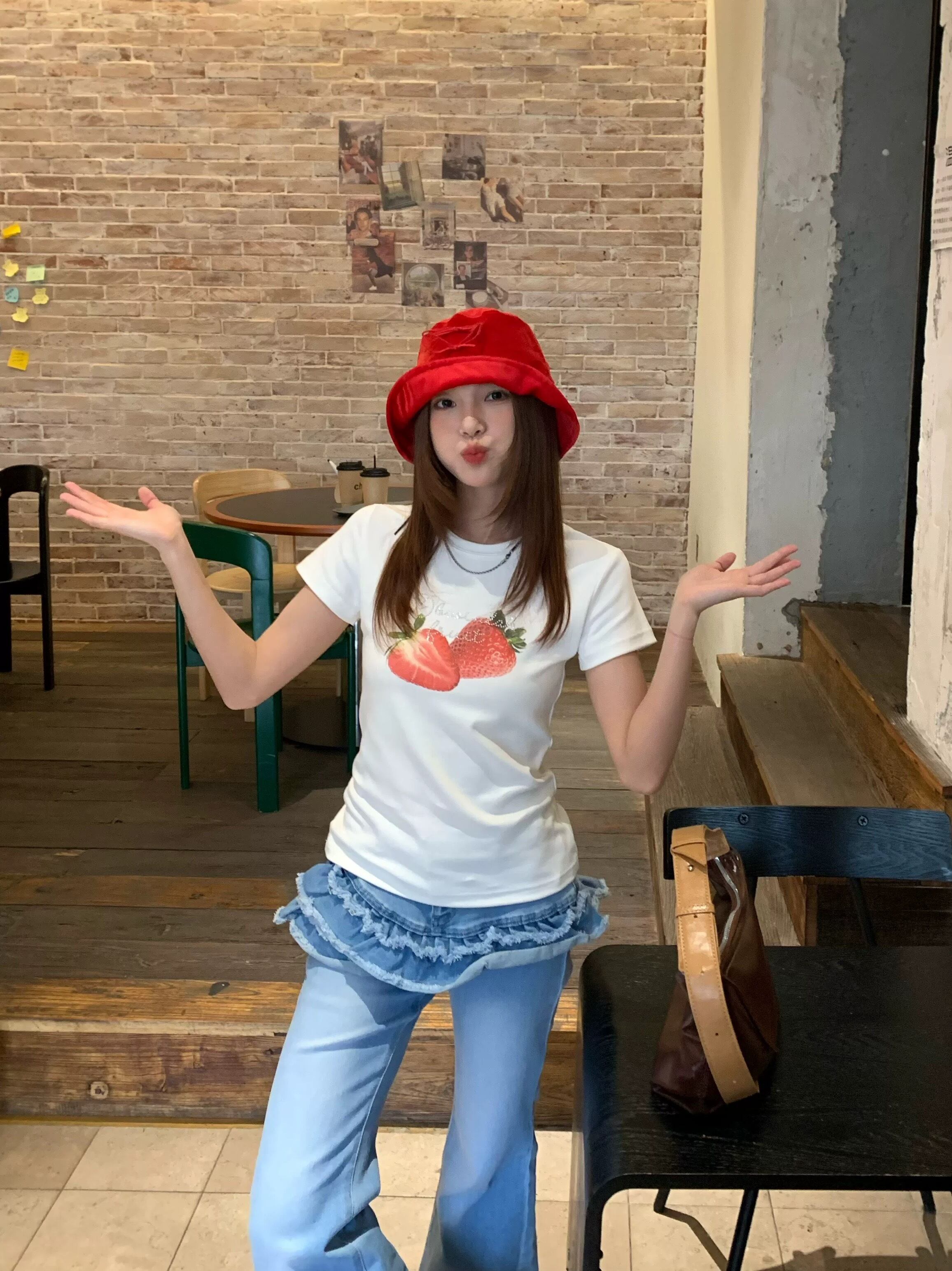可愛らしいいちご柄が目を引くデザインのTシャツです。
