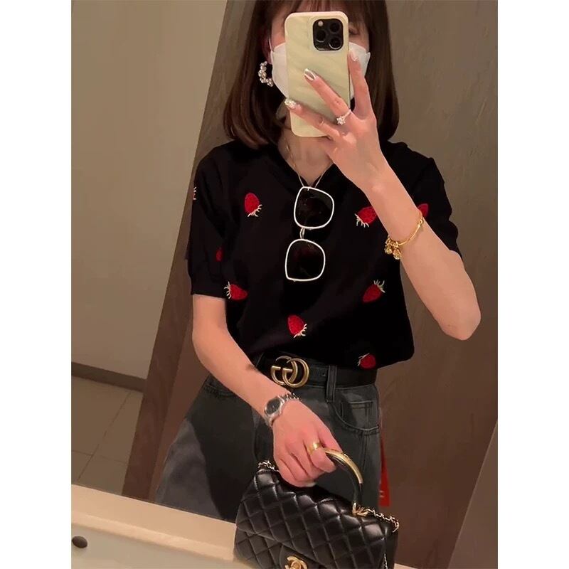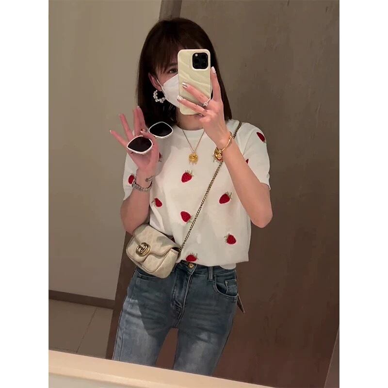 可愛らしいいちご柄が目を引くレディースTシャツです。