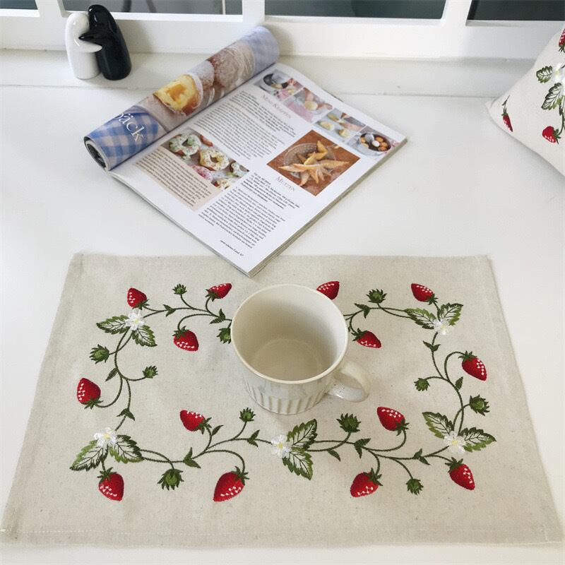 可愛らしいいちごモチーフがポイントのランチョンマットです。食卓を華やかに彩るアイテムとして大人気。