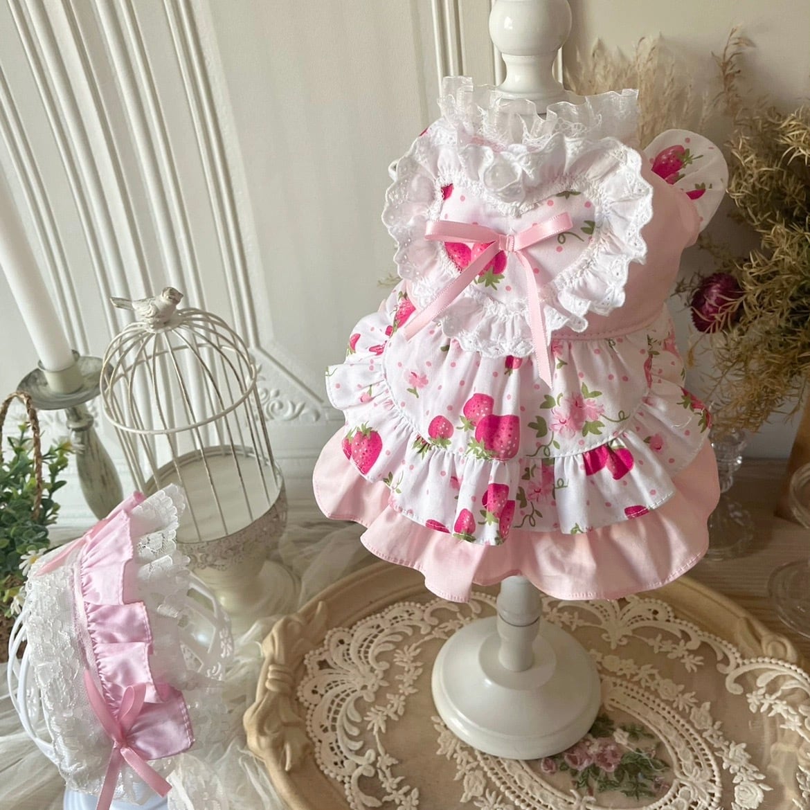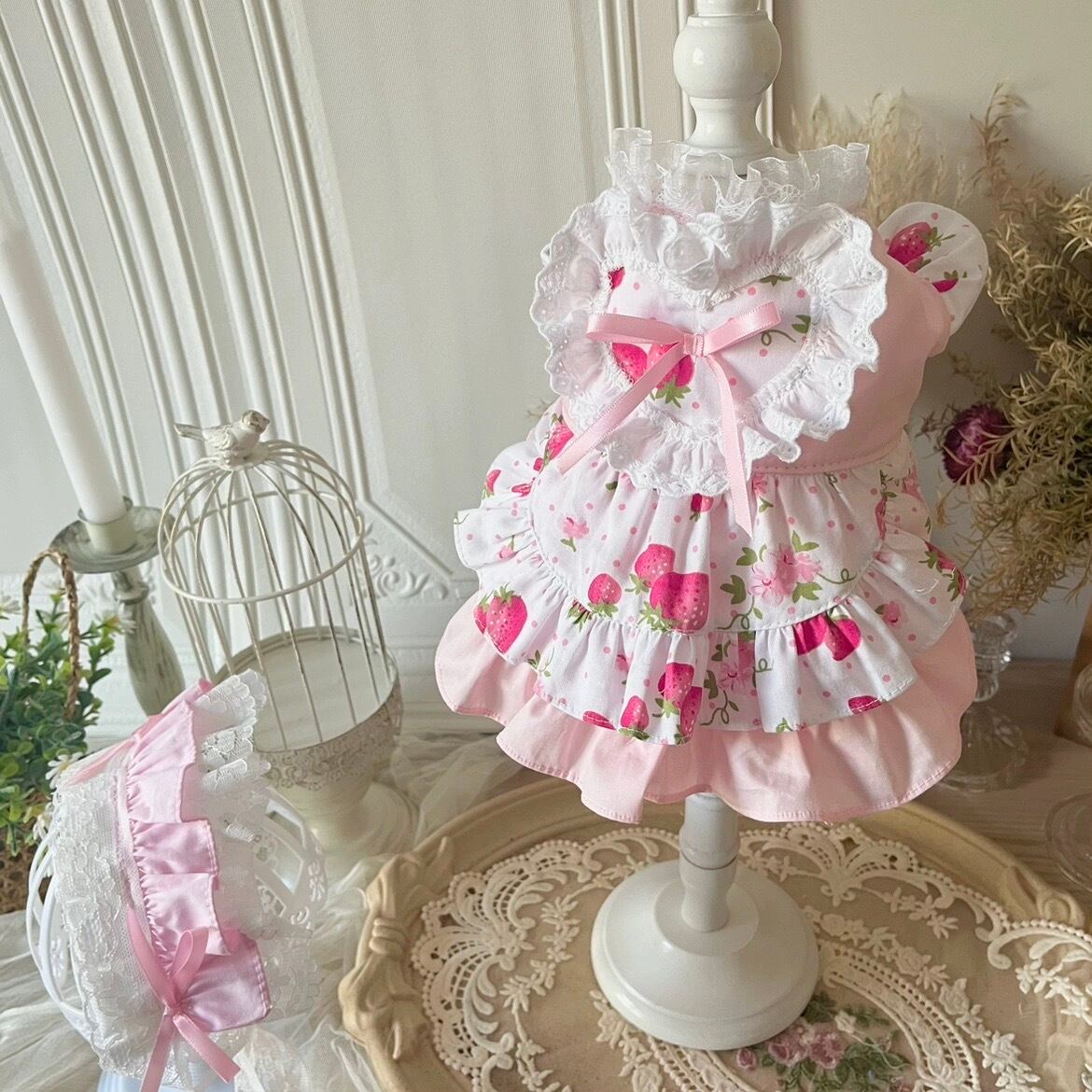 いちご柄のフリルワンピースのペットウェアです。