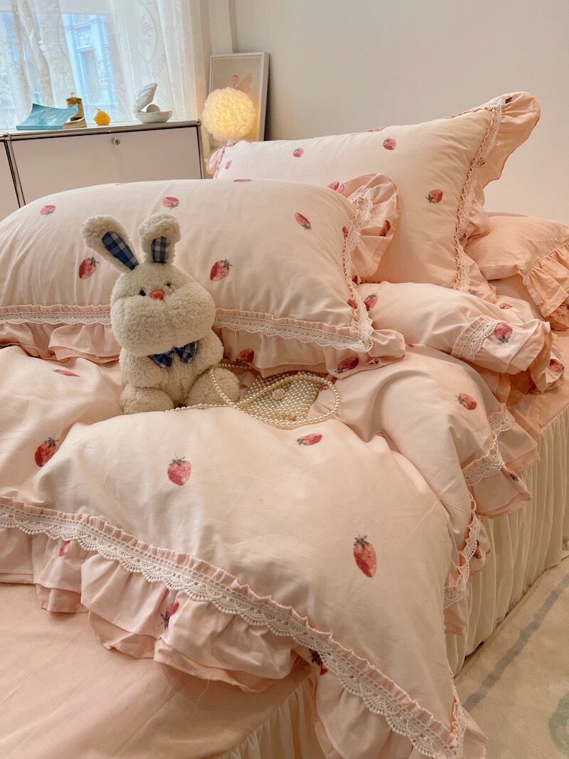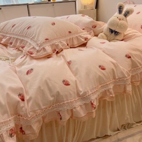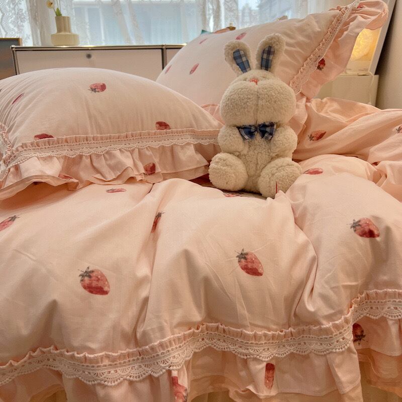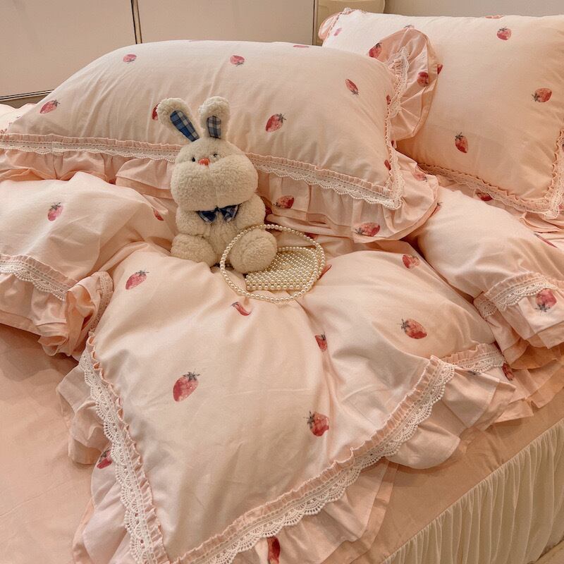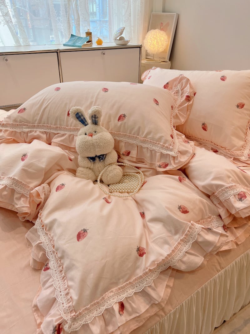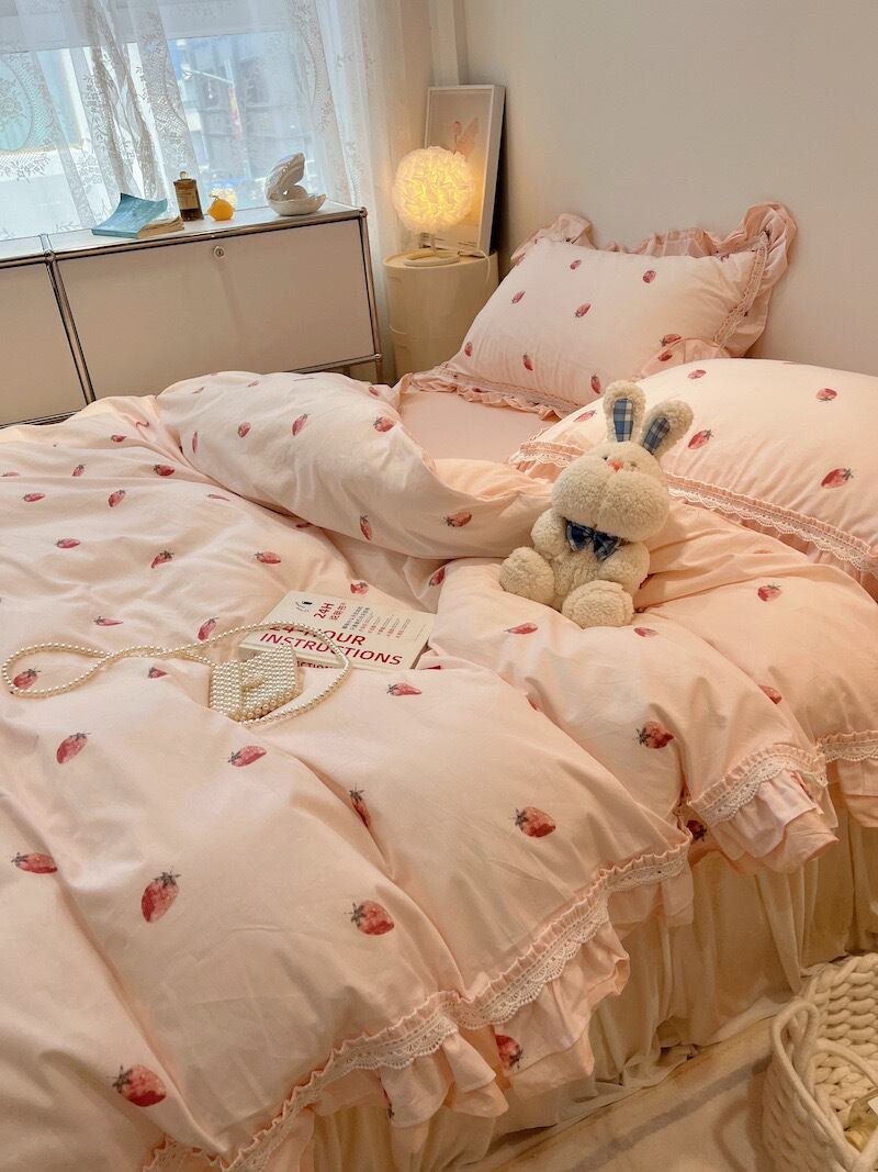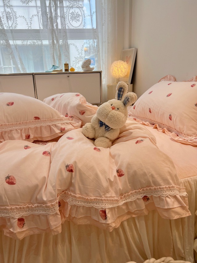 いちご柄の可愛らしさに癒されながら、心地よい眠りへと誘う布団カバー&枕カバーセット。