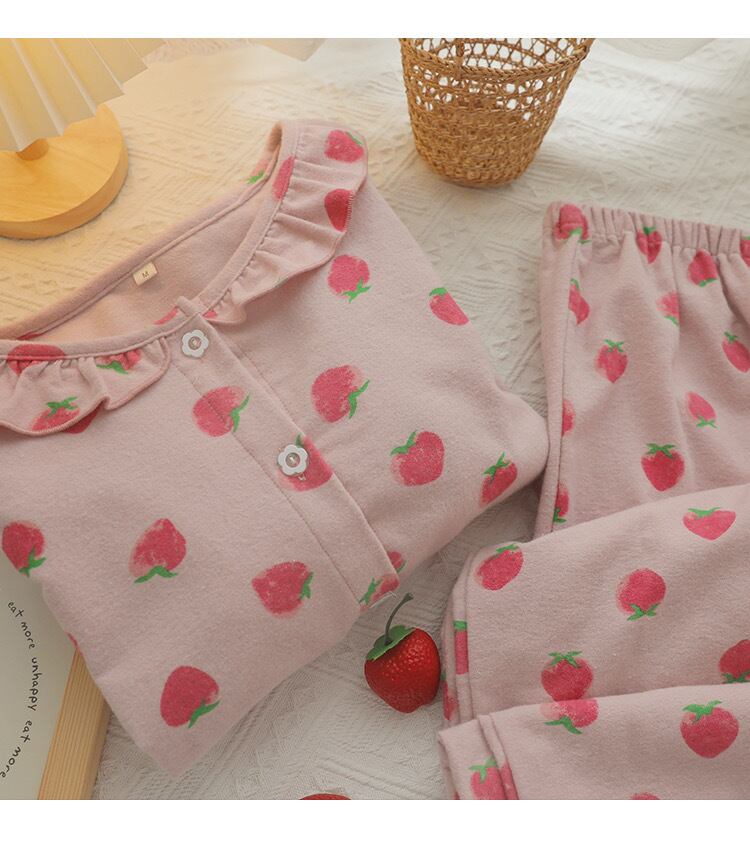 フルーツモチーフのいちご柄がチャーミングなパジャマは、リラックスタイムを盛り上げるアイテムです。