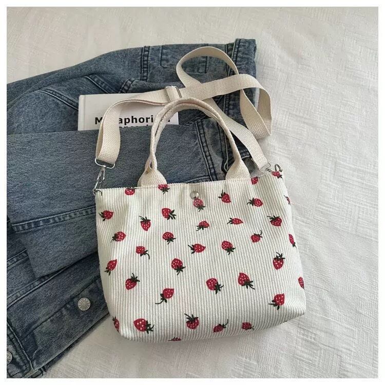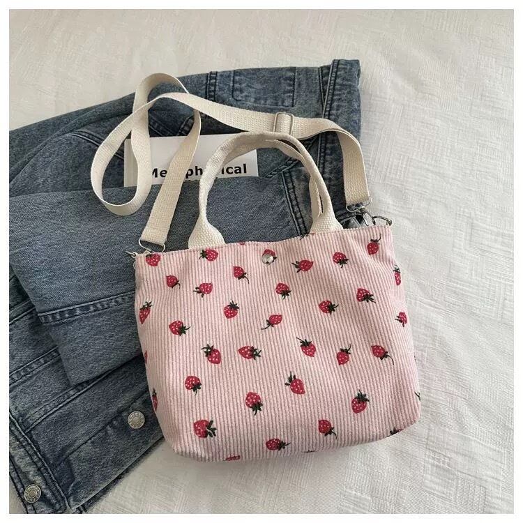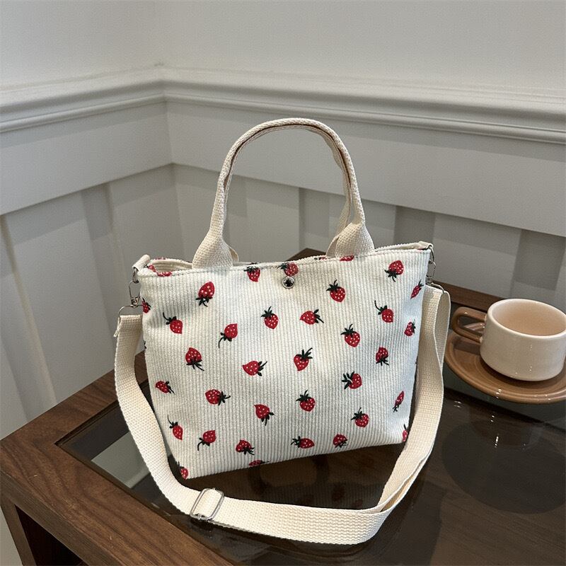 鮮やかな赤と白のいちご柄が目を引くアイテムです。